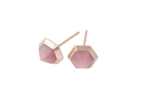 Hex set earrings are set with genuine Pink Opal pyramid-cut stone.