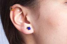 Earrings come in 7mm (on body in Lapis to show size). Available in 14K gold.