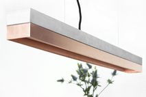 The rectangular pendant lamp [C1]copper is cast from a light grey concrete. It combines modern copper sheet with rough concrete into a timeless and elegant designer lamp. The different materials of the lamp shades can be changed and new combined at every time .