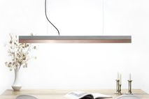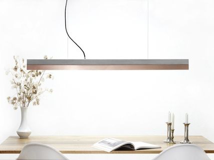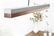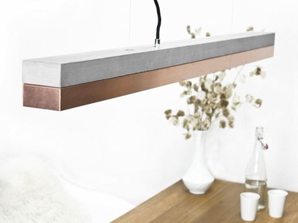 With an edge length of 122 x 8 x 8 cm, the lamp is perfect suitable over a long dining table, a sideboard or a desk. Due to its minimalist design and the contrasting materials- concrete and copper, the designer lamp can be combined with any style .