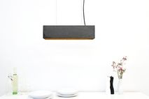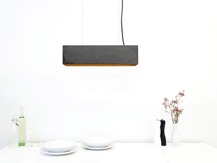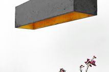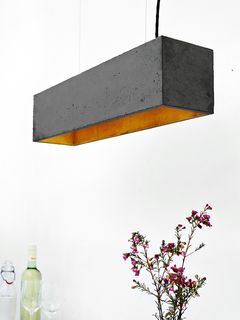 The rectangular pendant lamp [B4] is cast from a dark grey concrete. It combines noble gold with rough concrete into a timeless and elegant designer lamp. The high quality gilding of the insides emits a pleasant warm light.