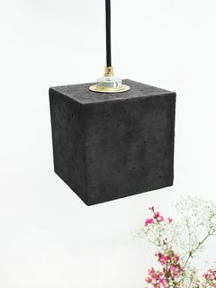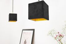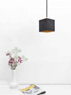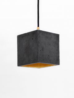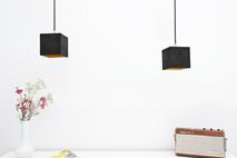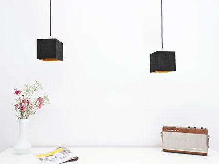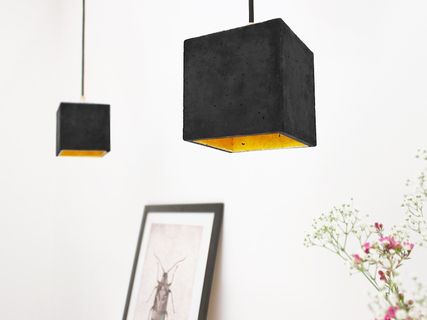 The cubic pendant lamp [B1] is cast from a dark grey concrete. It combines noble gold with rough concrete into a timeless and elegant designer lamp. The high quality gilding of the insides _ emits a pleasant warm light.