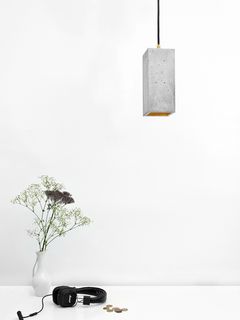 The rectangular pendant lamp [B1] is cast from a light grey concrete. It combines noble gold with rough concrete into a timeless and elegant designer lamp. The high quality gilding of the insides emits a pleasant warm light.