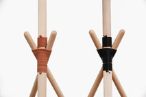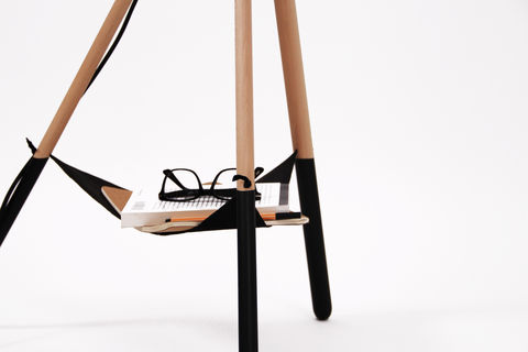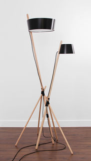 Ka XL is a standard lamp, which radiates ambient light. Its simple and elegant lines are drawn from a stylish structure of beech wood slats, a tripod shape and joined together by a leather thread. At the top of the pole is a large metal lampshade which filters the light through a natural cotton diffuser.