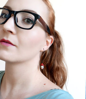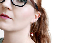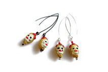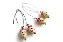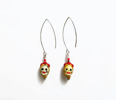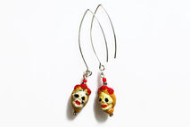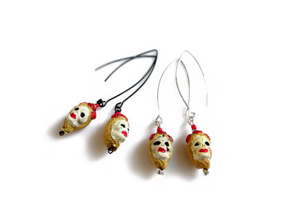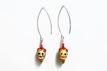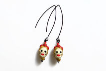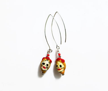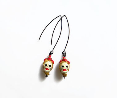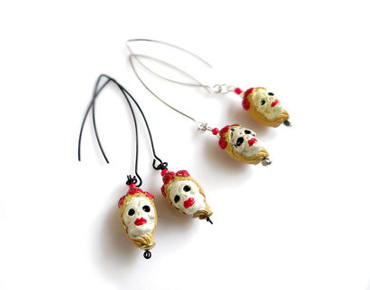 Beautifully detailed handcrafted ceramic beads in the Dia De Los Muertos theme with a blonde female skull. Artistic, unique, yet delicate these make a great statement pair. The skulls from super elongated silver or black plated earwires.