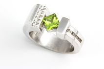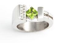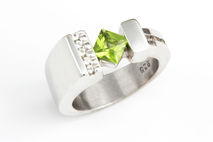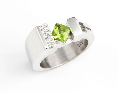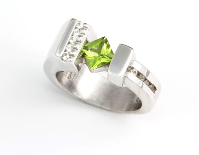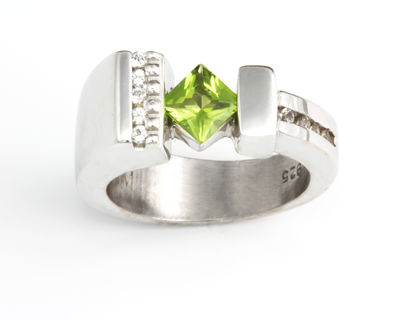Sterling silver ring with 5mm princess cut peridot (.75ct). Ring features channel and prong set white topaz accent stones (.15cts). This ring was hand carved and hand set. Please enter size needed at checkout. Some very small or large size requests may delay shipping.