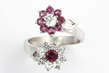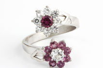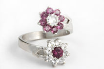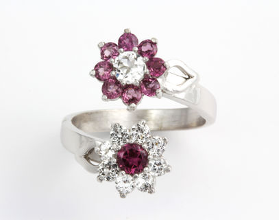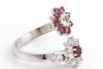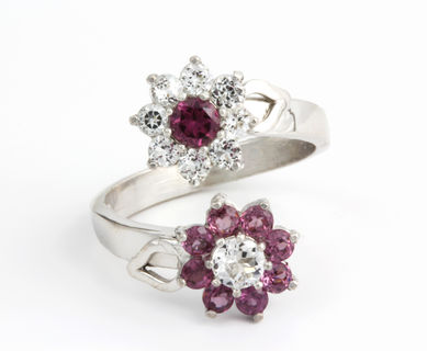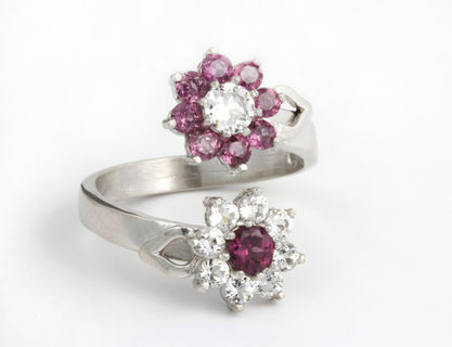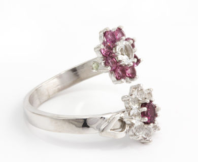 This adjustable flower ring is set with rhodolite garnets and white topaz (approx. 1.86cts). It is made of rhodium plated sterling silver. This flashy ring gets a lot of attention and makes for a perfect right hand ring!