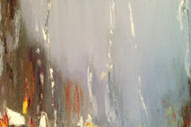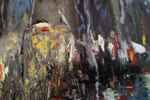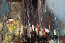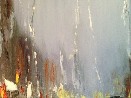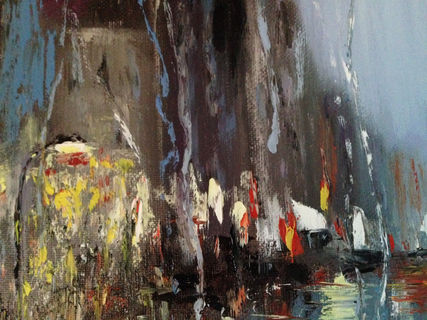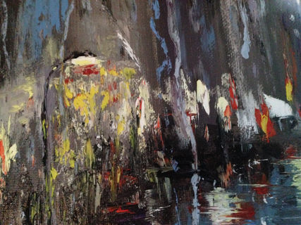 I have been meaning to paint a night city street. I also recently fell in love with the idea of a “through wet glass” look. I used several google pictures of a rainy evening and a wet glass as a reference. I did not use a brush with this painting at all. Instead, palette knife, piece of cloth and my fingers helped me. Please see the complete process of how i created the original painting here: