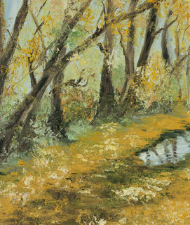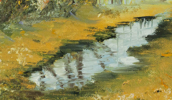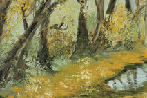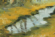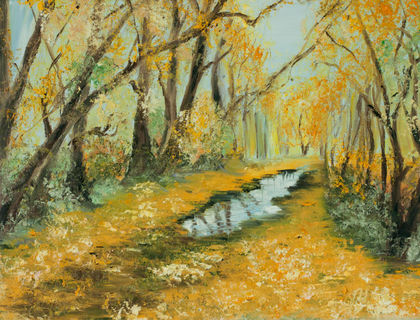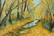 "Yellow forest alley" is depicting fall wet road in the woods or park. The puddle reflects the sky creating the autumn mood.