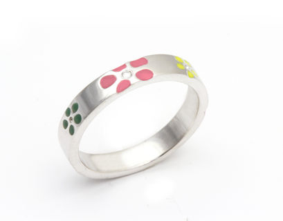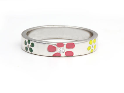 This ring is part of my stacking collection. This sterling silver band features a flush set .01ct diamond. This ring has a new enamel with ceramic-like hardness and features a hand-cut flower pattern. Each piece is signed on the inside with the NellMarie initials and a pink or blue flush set sapphire. Complimentary sizing at purchase.