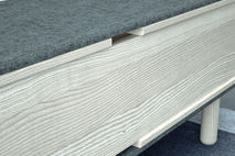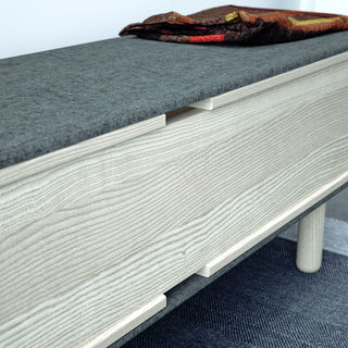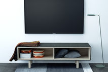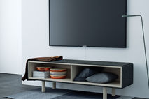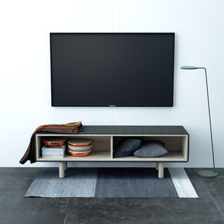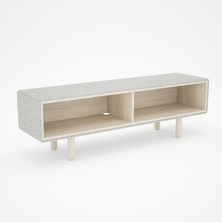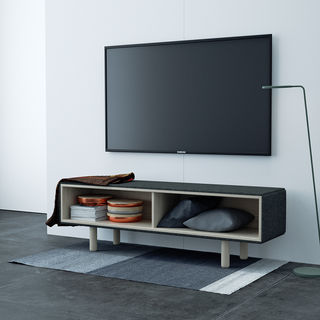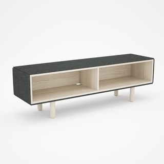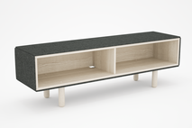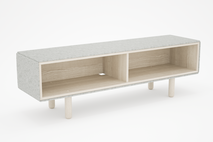 Solid ash wood and wool felt combine to make this one-of-a-kind media console. This piece is designed to house electronics while cleaver integrated wire management effortlessly manages cords. Available in light / medium / or dark grey wool felt upholstery.