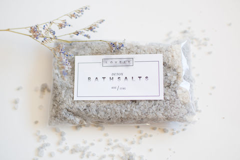 Detox Bath Salts: Dead Sea Salts, Bentonite Clay, Activated Charcoal, Sodium Bicarbonate, Sweet Almond Oil, Lavender Essential Oil, Eucalyptus Essential Oil.