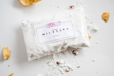 Floral Milk Bath Soak: Coconut Milk Powder, Sodium Bicarbonate, Dried Rose Petals, Lavender Buds, Jasmine Essential Oil, Lavender Essential Oil, Ylang Ylang III Essential Oil.