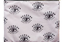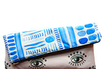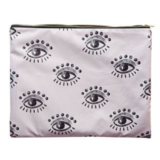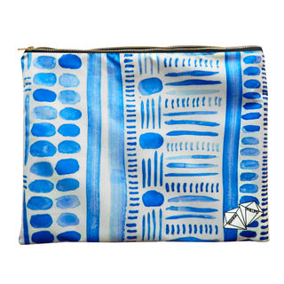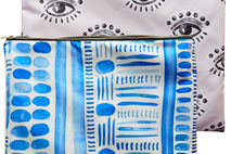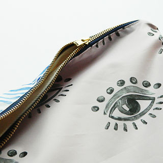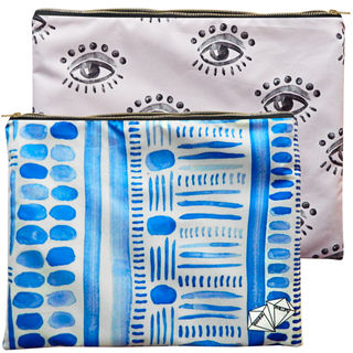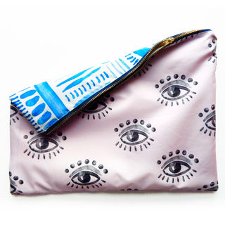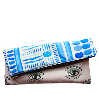 The 'Urban Surfside' collection combines upper east side ambience with beachy boho vibes. This versatile clutch bag consists of two separate prints that combine as one when folded over. Our new classic 'upper east eye' symbol print contrasts against the vibrant surfer blue tones on the opposite side of the bag. Colours and inspirations have been drawn together from travels to the coastal market town of 'Old Hammamet' in Tunisia, the white washed walls and blue window framework have been translated into print within this extra special design.