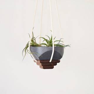 A stacked platform made of solid walnut and hung with cotton rope and solid brass ring, for potted plants or objects. Sized to be used with our concrete bowls.
