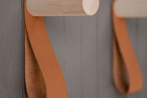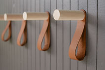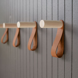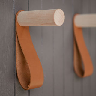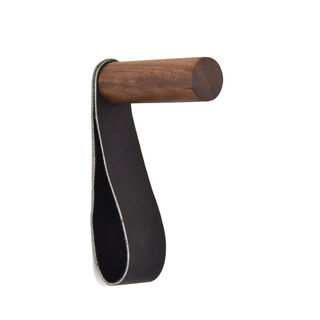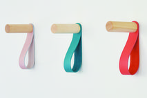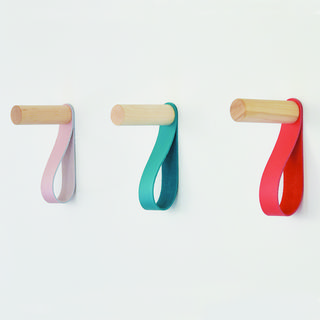 Pared down to the most basic elements, the Teddy Hook is a wooden peg hook with a simple leather strap for holding scarves or accessories. Pegs come in natural maple or finished walnut. Leather straps currently available in brown, black, pink, turquoise, or coral.