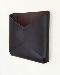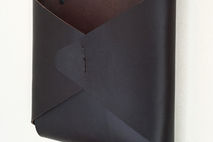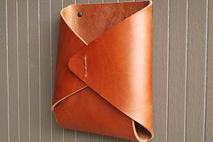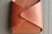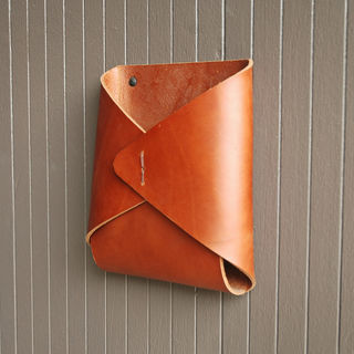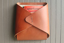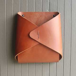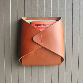 Thick latigo leather is folded into an envelope shape and hand stitched with waxed twine. The opening fits a standard magazine.