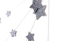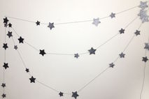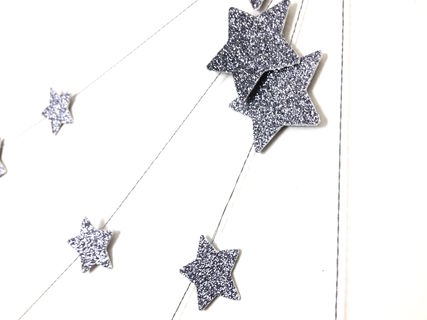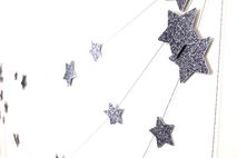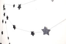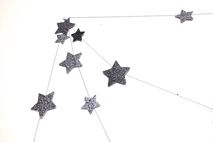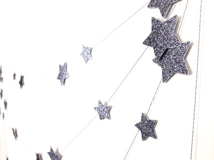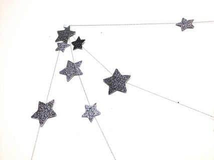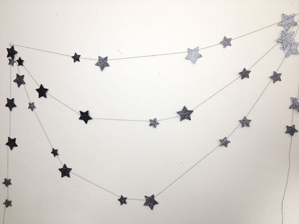 This glistening, charcoal sparkle garland is 10 feet long. Made of heavy card stock stars. Stars are a mix of 1.25" and .75" sizes across. Space between each varies as this garland is asymmetrical. Sparkly on both sides, and when it’s hung up it looks kind of like a star map of constellations when lines are drawn the connect the stars.