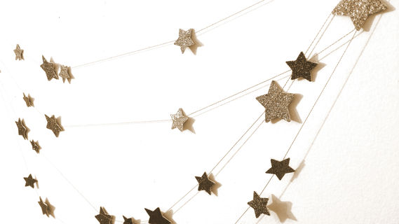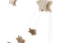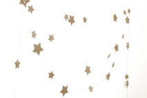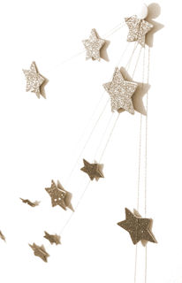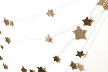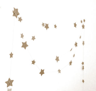 This glistening, champagne sparkle garland is 10 feet long. Made of heavy card stock stars. Stars are a mix of 1.25" and .75" sizes across. Space between each varies as this garland is asymmetrical. Sparkly on both sides, and when it’s hung up it looks kind of like a star map of constellations when lines are drawn the connect the stars.