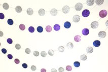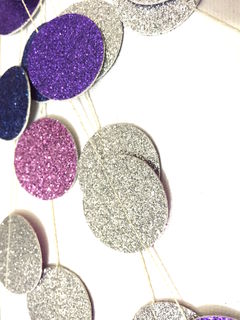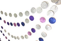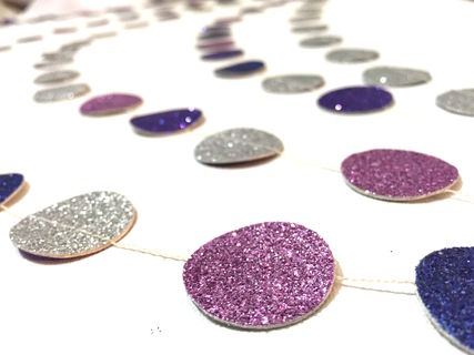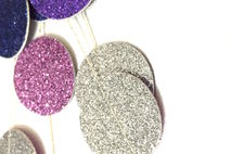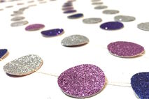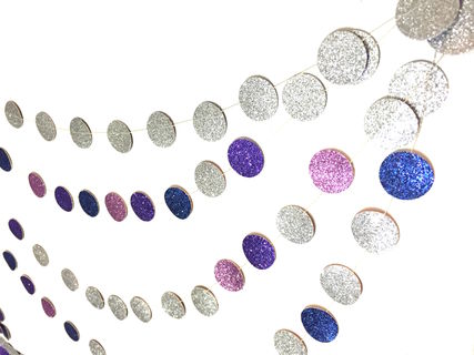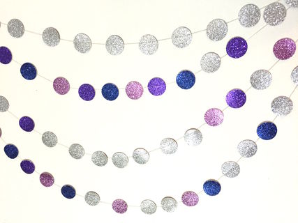 This glistening, silver, orchid, purple, and royal blue sparkle garland is 14 feet long. Made of heavy card stock circles. Circles are 1" across. Space between each circle is about 1". Sparkly on both sides, but each circle is silver on one side, and colored on the other. Some on the circles are a little warped and don't lay exactly flat, as you can see in image 1. Sewn with ivory thread.