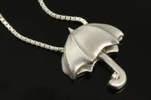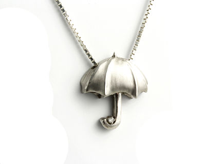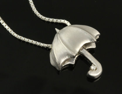 This pendant is hand carved by me. It is a rhodium-plated sterling silver pendant featuring a .02ct diamond on the handle. The umbrella is approximately 1" from top to bottom and includes an 18" diamond cut box chain. On the back is carved the phrase "for the rainy days".