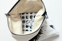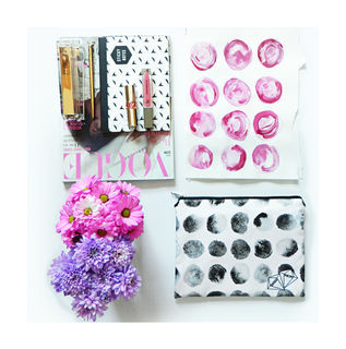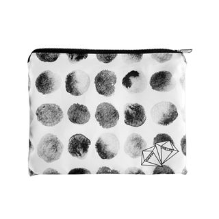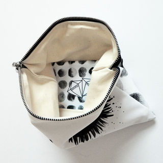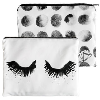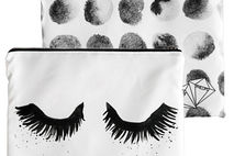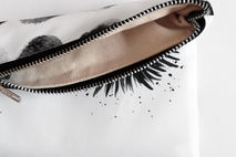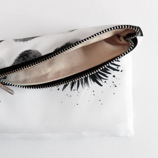 The 'Urban Surfside' collection combines upper east side ambience with beachy boho vibes. This versatile clutch bag consists of two separate prints that combine as one when folded over. Monochrome hand painted eyelashes contrast against texturised polka dots.