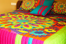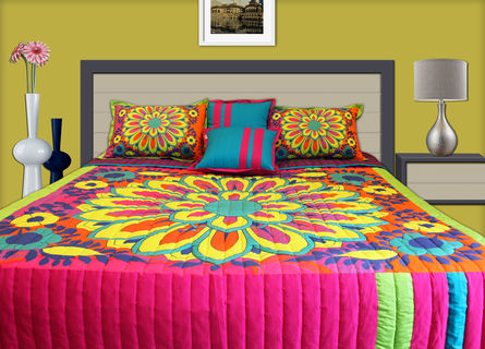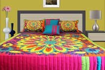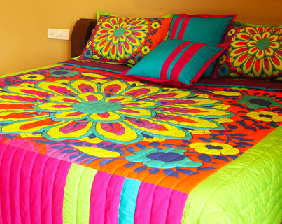 Update your bedroom interior with the Fatfatiya Designs, Big Flower Motif King Size Quilted Bedspread Set. Big Flower Motif King Size Quilted Bedspread Set is inspired from painted mansions of Shekhawati and has been designed to create a sense of style.Its impressive design is a blend of Quirky, Pop style with contemporary aesthetics. This stunning set can fit well with your bedroom settings. It can prove to be a thoughtful and unique gifting option.
