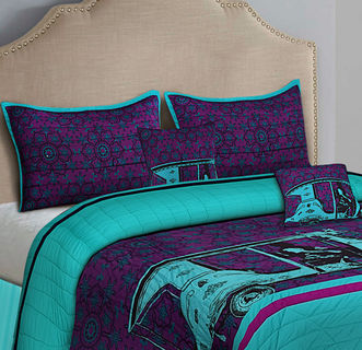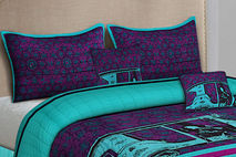 Update your bedroom interior with the Fatfatiya Designs, Green Taxi King Size Quilted Bedspread Set. Green Taxi King Size Quilted Bedspread Set is inspired from painted mansions of Shekhawati and has been designed to create a sense of style.Its impressive design is a blend of Quirky, Pop style with contemporary aesthetics. This stunning set can fit well with your bedroom settings. It can prove to be a thoughtful and unique gifting option.