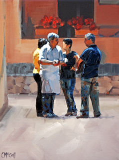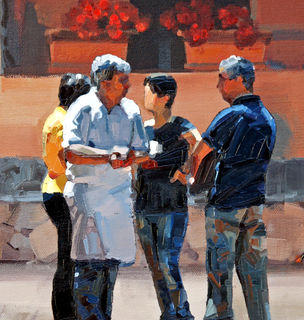 Good friends deep in conversation on the cobbled streets of Italy.