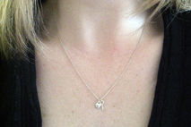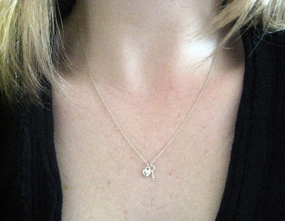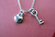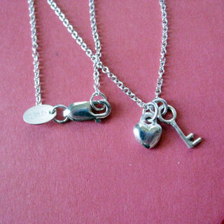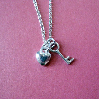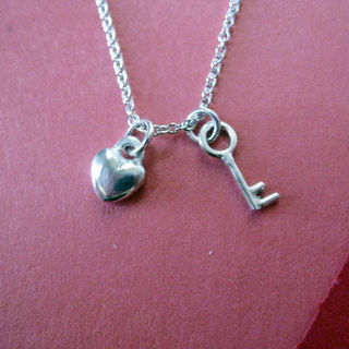 The teeny heart measures just 3/16" and the key is a mere 3/8" long. They hang from a 16" or 18" cable chain that closes with a lobster clasp. The entire necklace is made from sterling silver.