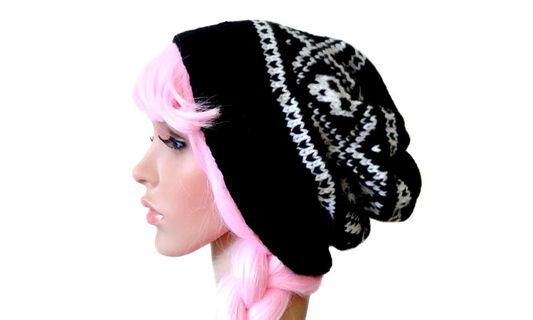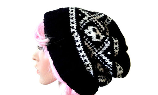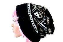 Be one of the coolest chicks in town with this amazing knitted fairisle slouchy beanie. Hand knitted using a black acrylic yarn with a white fairisle skull pattern, a piece like this will definitely get you noticed.