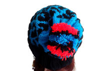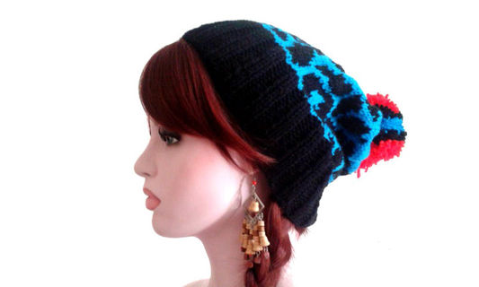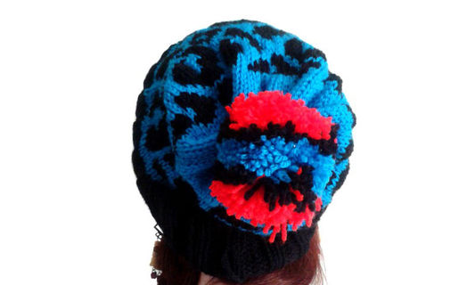 This super trendy leopard print beanie is hand knit using a turquoise/black acrylic/wool blend yarn. The beanie has a pom pom made with black, turquoise and red yarn giving it a look that will guarantee to stand out from all the other normal beanies in town!!