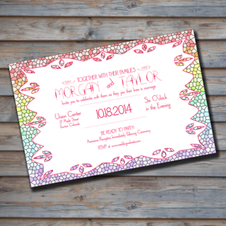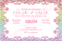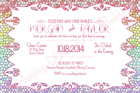 This listing is for one personalized , DIGITAL, printable copy, Rainbow Stained Glass wedding invitation. Personalized with your event information. This casual wedding invitation measures 4x6 inches. Fun, bright, colorful. Perfect for when you love colors so much you just want them all!