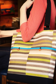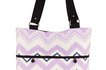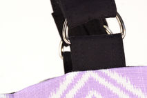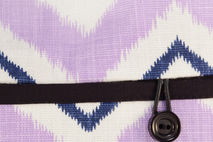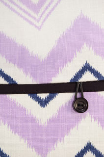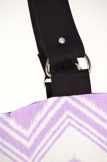 For this shoulder bag, I have chosen a modern, chevron patterned canvas. The chevrons of purple and navy are printed on a white background and have an ikat styling to them. This distinctive print is accented by a solid black, cotton lining. Black, heavy weight, blended canvas is used for the bottom and strap. The black lining, bottom and straps offer a neutral background that make this chic chevron pattern even more eye-catching.
