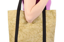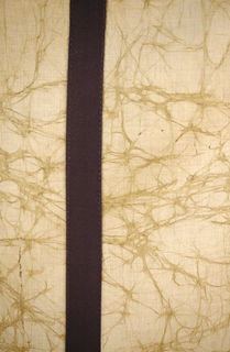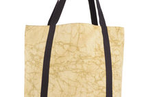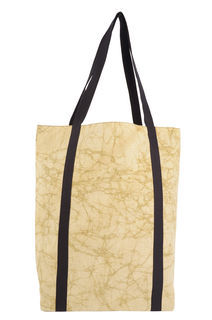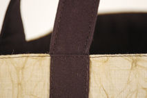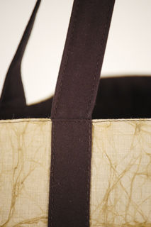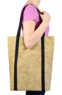 The exterior of this tote is made with a beige batik fabric. It's intricate design of tan lines of a creamy background evoke images of webs or cracks on a sidewalk. A solid black cotton fabric is used for the straps and lining. Both fabrics are 100% cotton. This tote is made as a single edition.