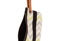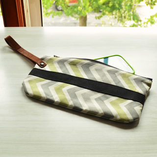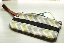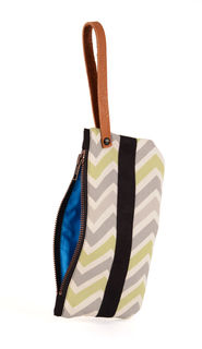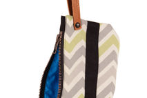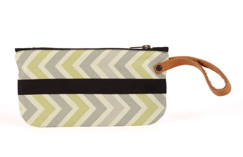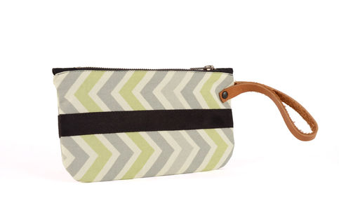 For this wristlet I have chosen a chic and modern chevron print. The pattern has grays and a muted sage green chevrons on a natural canvas background. It is available in a classic black, crocus purple, or turquoise cotton lining. Slim and stylish, this wristlet is the perfect accessory for when you just need to carry a few things.