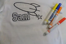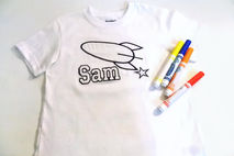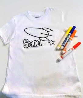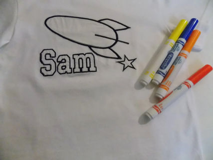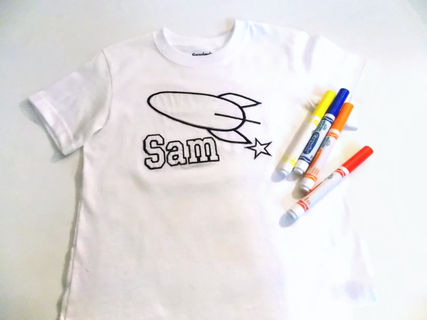 This Color Your Own Tee has an Embroidered Rocketship design for a fun Tshirt kids can color, Wash and then Recolor for new style with each wear. Black satin stitching borders white fabric so your artist can stay in the lines if they want to. Each shirt is sealed at the black stitching to minimize color run. I carefully line the inside of the shirt so that the shirt is a comfortable as it is awesome.