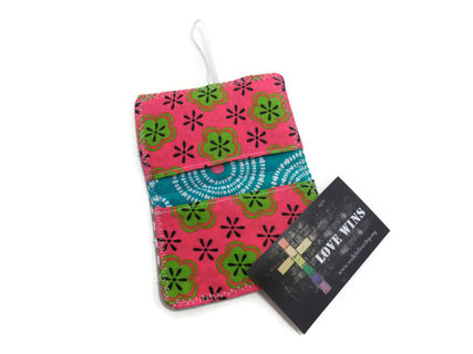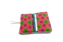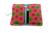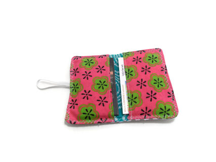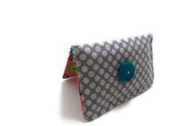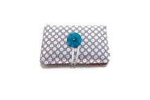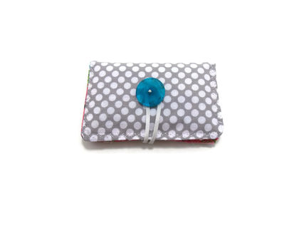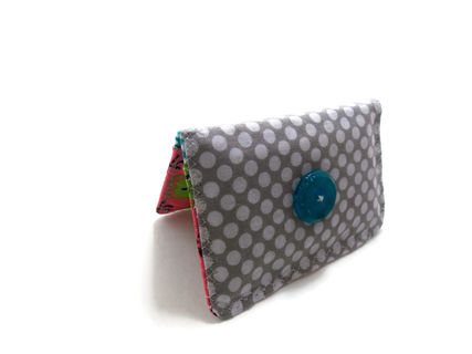 This cute grey polka dot business card wallet has two pockets to hold your business cards and credit cards. Simply grab and go. I sew together fun pieces of cotton to make this business card case / credit card billfold extra unique. A sweet teal button and elastic loop securely close this pocket sized card case. I carefully sew and top stitch each wallet to ensure durability and a long happy life of shopping and business networking.