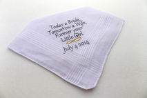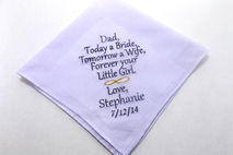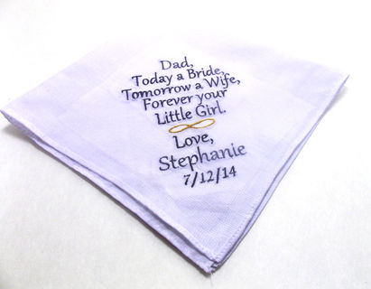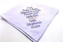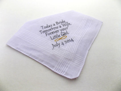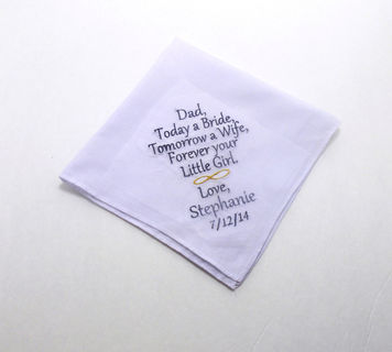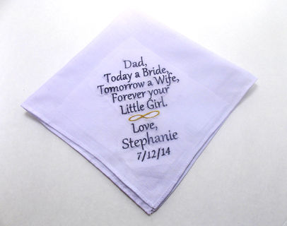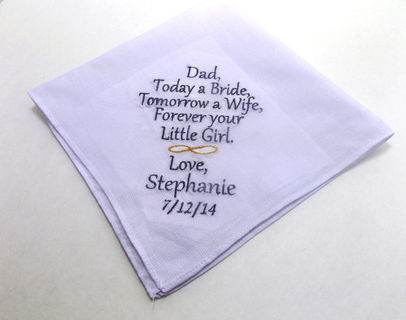 Custom embroidered with "Today a Bride, Tomorrow a wife, Forever your Little Girl." an infinity symbol to remind Dad that your love for him is eternal and the date of your wedding. Colors pictured are silver and a metallic gold. I can use your wedding colors as well.