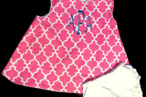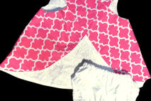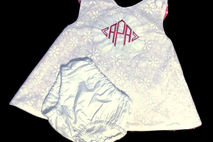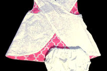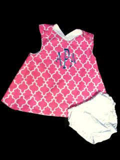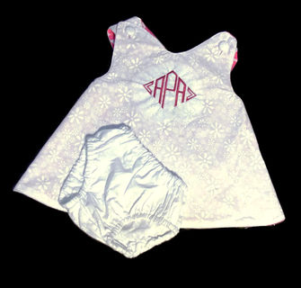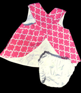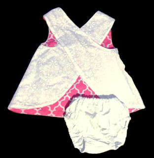 This sweet little vintage style dress, made popular in the 1960s and 1970s has a great swing and with it's criss cross back, allows your baby to stay cool and look precious with her bloomers showing. Reversible white on white floral and hot pink quatrefoil combine to give you two custom looks in one cute dress. I use top quality boutique style fabric, the highest quality embroidery thread and finish the dress with added top stitching to ensure durability a clean looking edge. Buttons are cloth covered in the fabric of the dress. Because of the criss cross back, this dress grows with your baby quite a bit. All dresses come with coordinating bloomers.