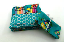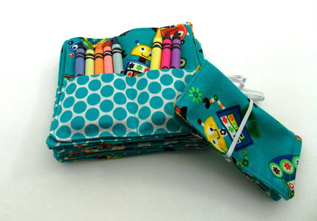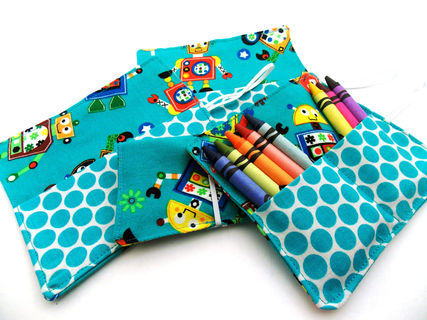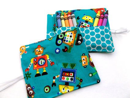 This crayon wallet is Retro-style Robots in teal with polka dot pocket. Perfect for little artists. High quality fabric Handmade