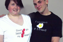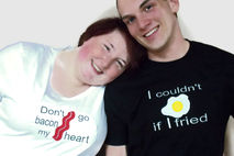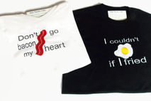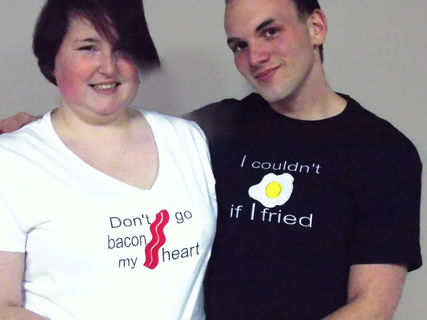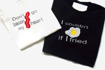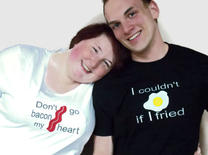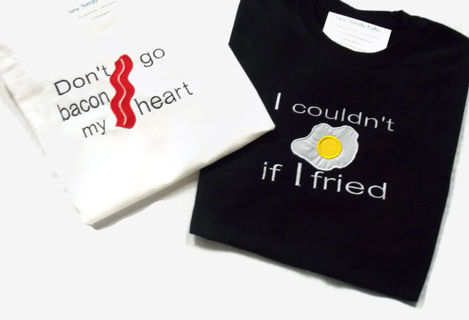 This Don't Go Bacon My Heart Couple's tshirt set is geekery at its finest. Boutique quality Embroidered and appliqued Egg and Bacon couple's shirts is what every nerd couple needs. Just making these funny shirts brings me fits of happy giggles. Want to know what to get the most epic of awesome couples , who already has all things logical? This whimsical pun-tastic tee shirt set.