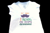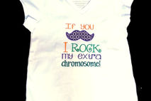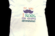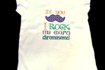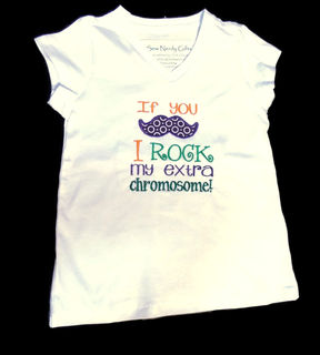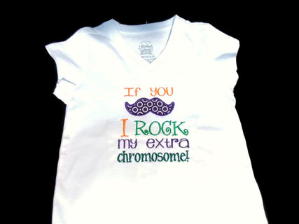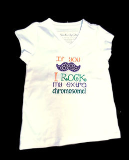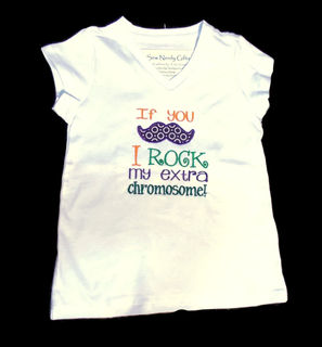 Sweet little tee for your sweet miracle. Down Syndrome Awareness and Mustache humor custom embroidered and appliqued onto your child's tee or bodysuit. Child sizes are cotton Tshirts in your choice of colors. Baby sizes 18 mos and smaller are embroidered onto a white one piece body suit.