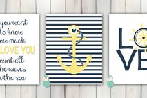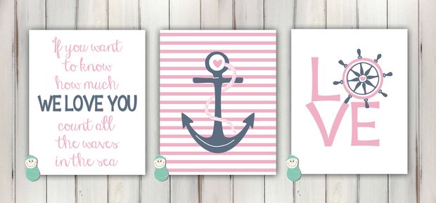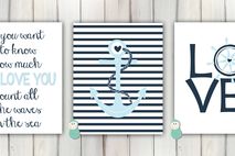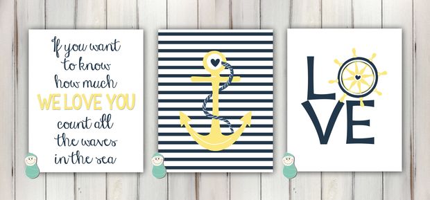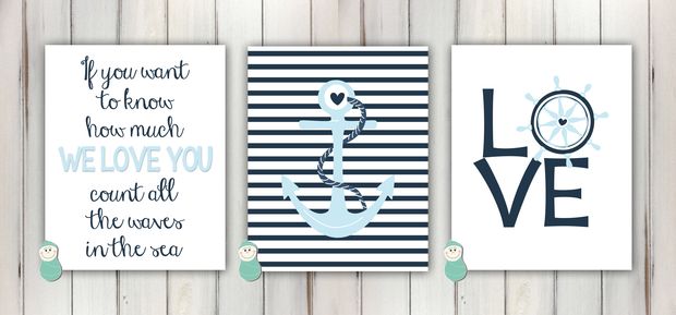This gorgeous nautical themed set of 3 is perfect for your little captain's room. Full quote reads "If you want to know how much we love you count all the waves in the sea."