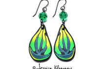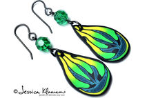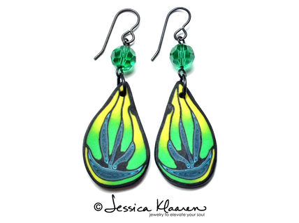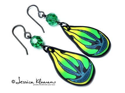 This pair of earrings feature vibrant green and yellow polymer clay wing cane-work charms and Swarovski crystals. The ear wire are darkened steel, which are nickel and lead free. These measure about 2.25 inches long.