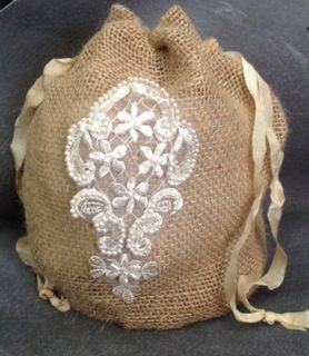 Our shabby pouch is pure woven jute, embellished with a hand stained beautiful beaded applique and accents with ribbon pull ties. Perfect for shabby settings, rustic chic weddings, gift bag, plant cover or our client's favorite suggestion, it holds one roll of bathroom tissue!