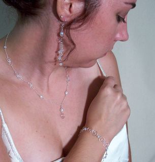 Hand-tooled Sterling Silver spirals accented with Swarovski Crystals in Opal and Clear feature Freshwater Pearls in this beautiful bridal set of Necklace, Earrings and Bracelet.