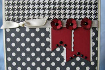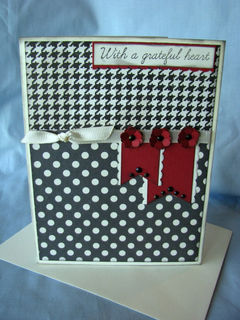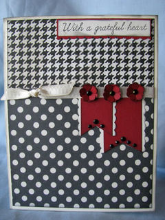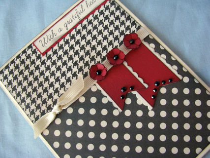 The card measures 5X6.5" and has a ivory colored base. The front is embellished with houndstooth and polka dotted patterned papers as well as red cardstock. The words "With a grateful heart" are hand stamped. The finishing touches are the ribbon and three layered paper hearts that have rhinestone centers, as well as the rhinestones lining the bottom part of the red "banners".