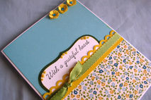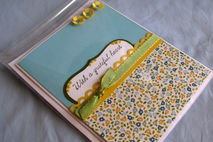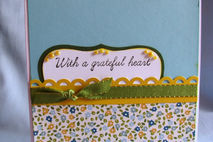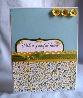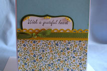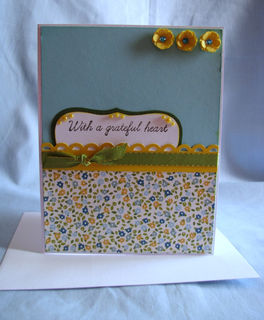 the front of the card is layered with cardstock and a floral patterned paper. The card is embellished with ribbon, pearls and punched paper flowers that have rhinestones added to the center. The sentiment "With a grateful heart" is hand stamped.