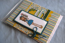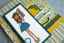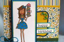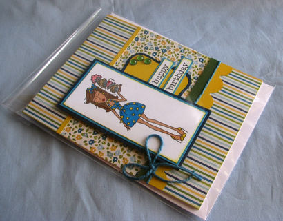 Need a birthday card for one of the ladies in your life? This handmade birthday card is perfect for all ages. The front of this 5X6.5" card is layered with several patterned papers and cardstocks. The star of the card is a digital stamp (by bugaboo stamps) that is printed and hand colored by me. The sentiment "Happy Birthday" is hand stamped. The card is finished off with some turquoise colored twine and some acrylic dots.